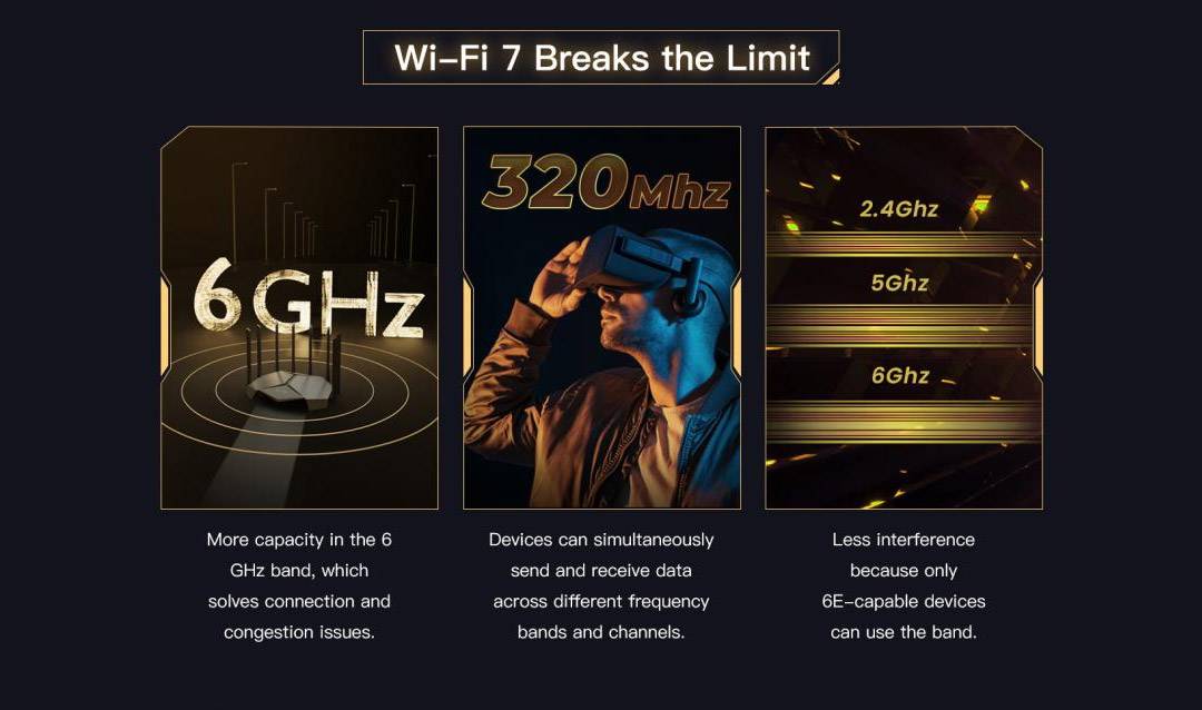 Hơn nữa, Wi-Fi 7 không chỉ bao gồm băng tần 2.4 GHz và 5 GHz mà còn thêm băng tần 6 GHz. Nó cũng hỗ trợ công nghệ Multi-Link Operation (MLO). Ba băng tần có thể được sử dụng đồng thời.