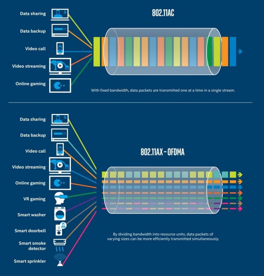 Cơ chế của OFDMA hoạt động bằng cách chia các kênh thành sóng mạng phụ, sau đó cho phép chúng truyền đến điểm cuối (thiết bị) trong cùng một lúc. Bộ định tuyến WiFi 6 có khả năng gửi đi nhiều tín hiệu khác nhau trong cùng một cửa sổ truyền.