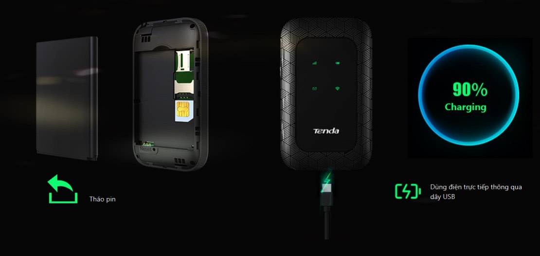 Trang bị viên pin dung lượng cao đến 2100 mAh , Tenda 4G180 có thể hoạt động liên tục đến 10 tiếng, và có thể cấp nguồn thông qua cổng USB.