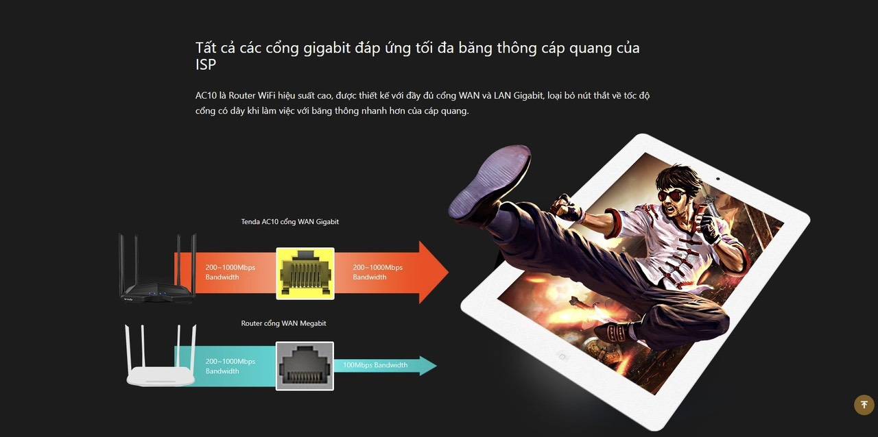 Với CPU tốc độ 1GHz tiến trình 28nm, Tenda AC10 đảm bảo khả năng xử lý mạnh mẽ và tiết kiệm năng lượng, ít tỏa nhiệt. Đáp ứng tốt với cáp quang với băng thông trải dài từ 50 M, 100 M, 200 M đến thậm chí 1000 M, tận hưởng chơi game và xem video HD mượt mà.