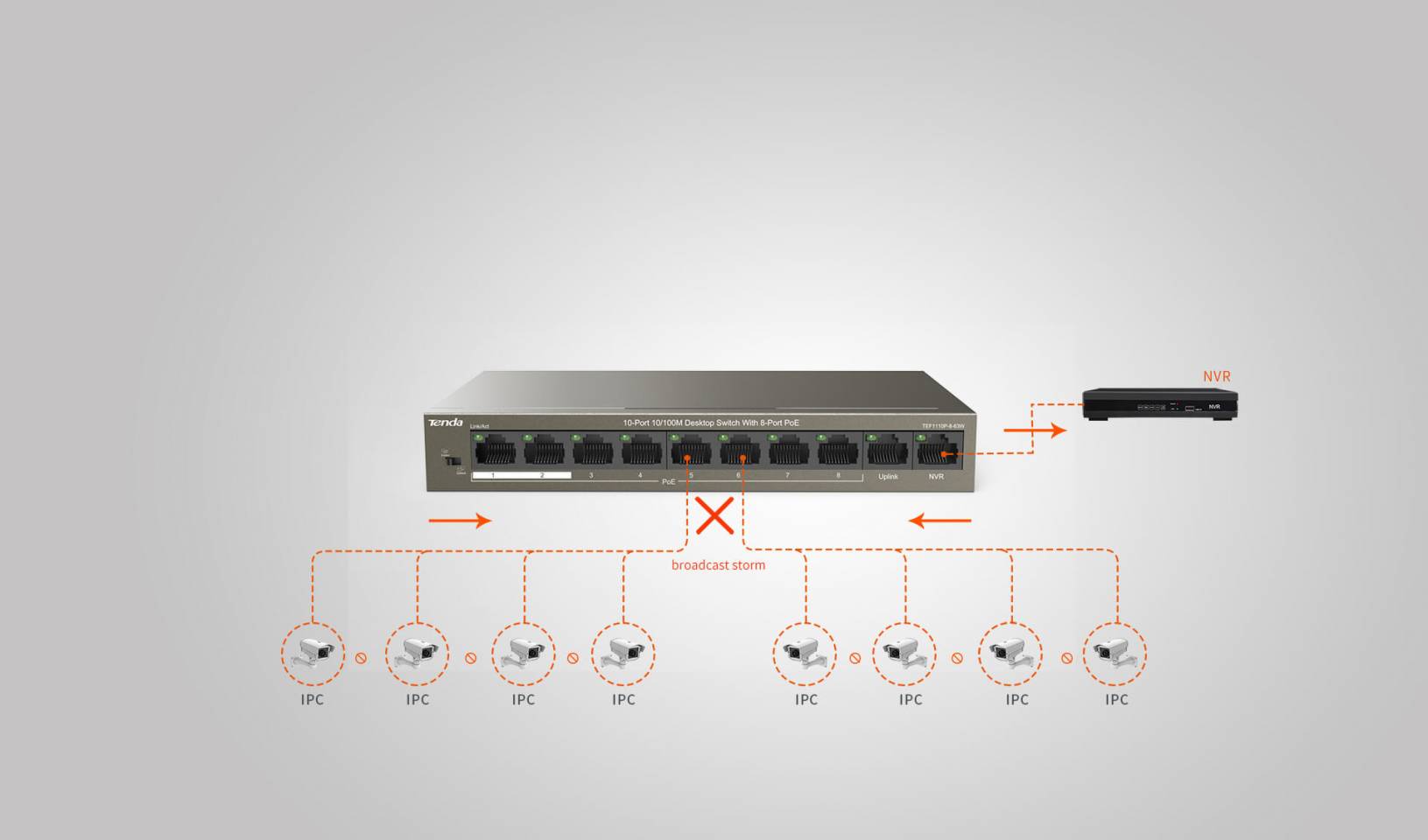 Khi sủ dụng chế độ Extend , cổng 1-8 được cô lập với nhau, nhưng vẫn kết nối với 2 cổng Uplink. Giúp switch không bị tràn broadcast, đảm bảo cho hệ thống CCTV hoạt động ổn định.