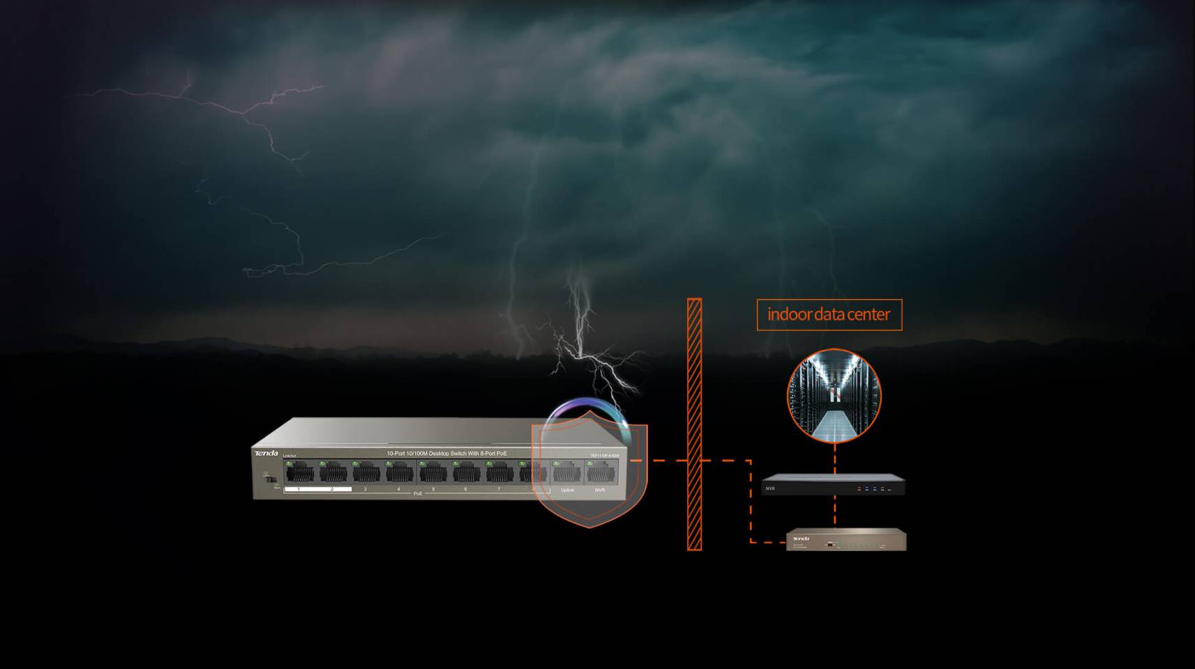 TEF1110P-8-63W hỗ trợ chống sét lên đến 6KV cho cổng Uplink , và 4KV cho nguồn, giúp bảo vệ thiết bị khỏi sét lan truyền trong điều kiện mưa bão.