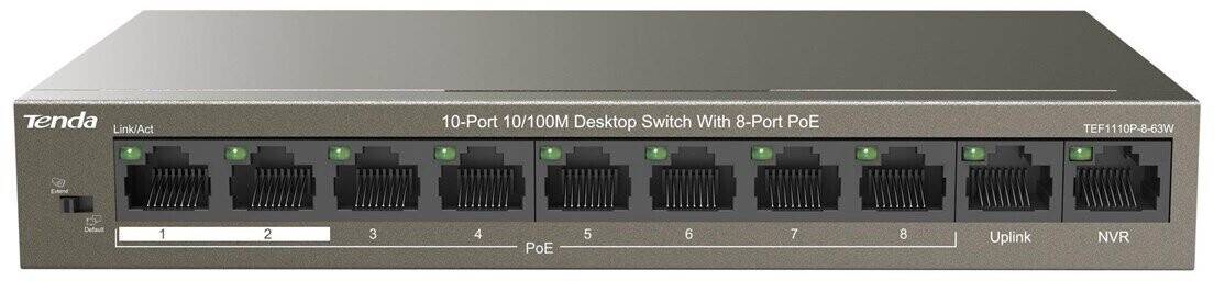 TEF1110P-8-63W là switch PoE unmanaged với 2 cổng uplink, được thiết kế riêng bởi Tenda.