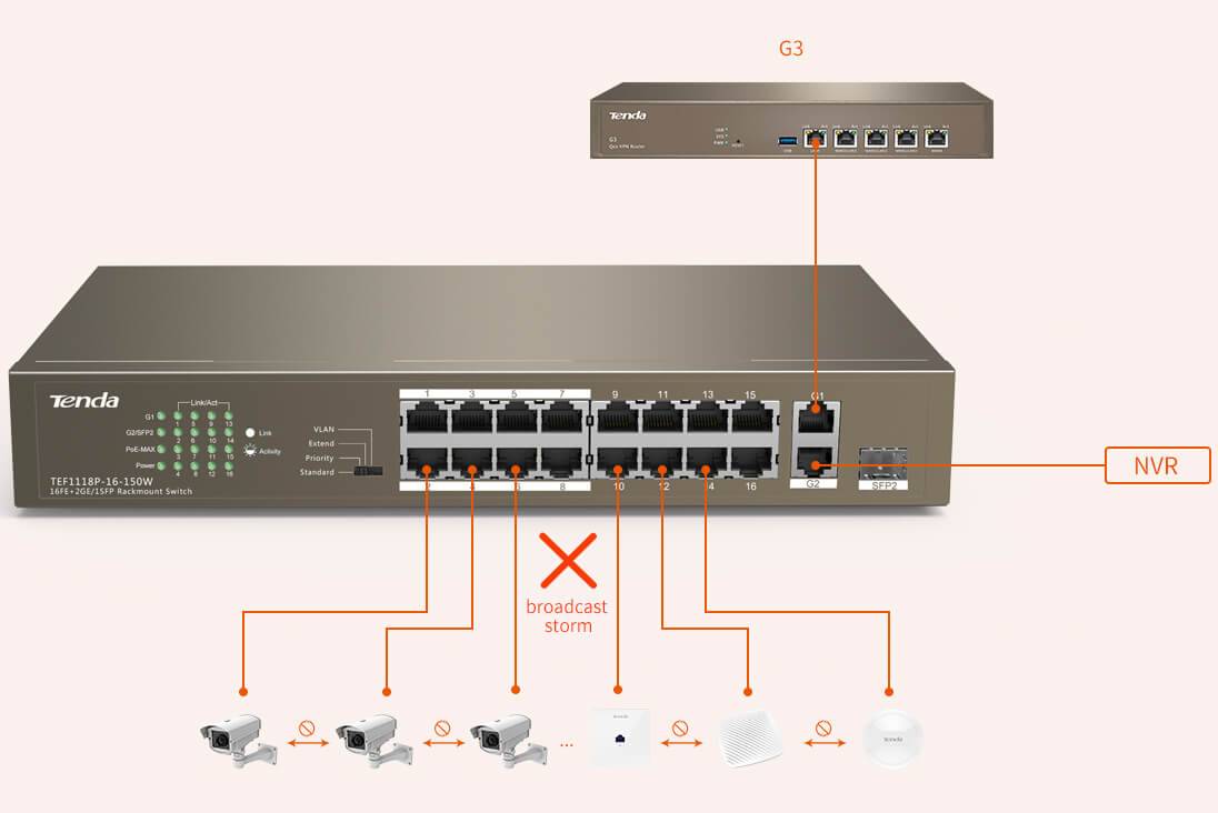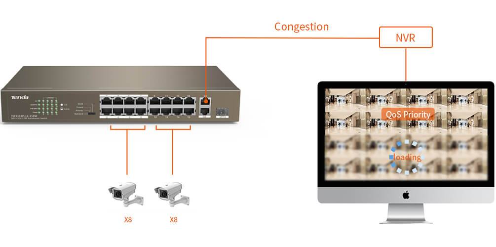 Trong chế độ này, cổng từ 1 đến 8 có độ ưu tiên cao hơn các cổng khác, và tất cả các cổng có thể giao tiếp với nhau. Khi switch được kết nối với nhiều camera IP, bạn nên sử dụng chế độ này để có truyền tải mượt mà hơn với các camera IP chính được kết nối vào các cổng ưu tiên cao hơn, và kết nối các cổng uplink (cổng G1 & G2/SFP2) với các thiết bị uplink (như NVR hoặc Router).