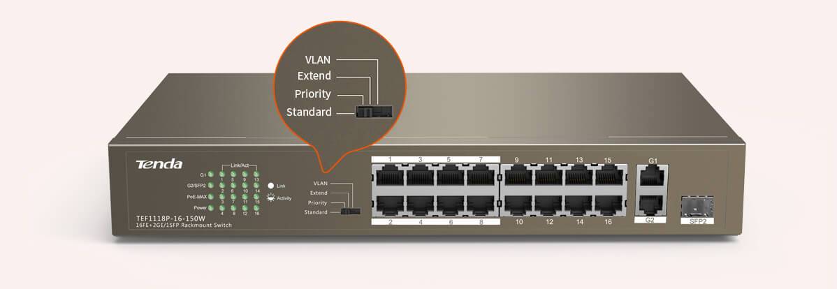Chế độ tiêu chuẩn, chế độ ưu tiên dựa trên cổng, chế độ VLAN dựa trên cổng và chế độ mở rộng giúp TEF1118P-16-150W có khả năng xử lý các mạng khác nhau, đặc biệt cho dự án giám sát IP và phủ sóng Wi-Fi quy mô nhỏ và trung bình.