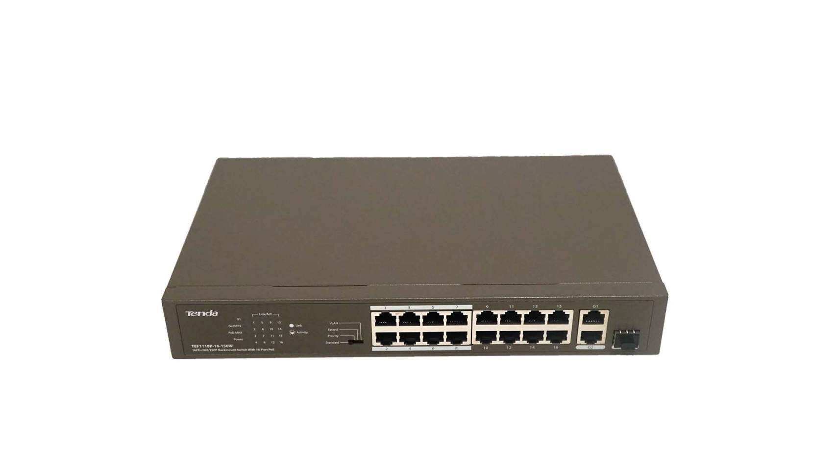 TEF1118P-16-150W là một switch PoE không quản lý do Tenda thiết kế độc lập. Nó tuân thủ các tiêu chuẩn IEEE 802.3af và IEEE 802.3at, có thể nhận diện thiết bị được cấp nguồn PoE một cách thông minh. Với công suất cấp nguồn PoE tối đa là 150 W, và 30 W cho một cổng đơn, nó có thể cung cấp nguồn điện khi truyền dữ liệu với các thiết bị AP, camera IP và điện thoại IP. Switch hỗ trợ 4 chế độ làm việc, bao gồm chế độ tiêu chuẩn, ưu tiên, mở rộng và VLAN, là lựa chọn lý tưởng cho các doanh nghiệp vừa và nhỏ, khách sạn, trường học, nhà máy có yêu cầu giám sát video và mạng không dây.